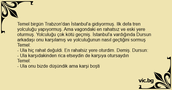 Temel birgün Trabzon'dan İstanbul'a gidiyormuş. Ilk defa tren yolculuğu yapıyormuş. Ama vagondaki en rahatsız ve eski yere oturmuş. Yolculuğu çok kötü geçmiş. İstanbul'a vardığında Dursun arkadaşı onu karşılamış ve yolculuğunun nasıl geçtiğini sormuş Temel: - Ula hiç rahat değuldi. En rahatsiz yere oturdim. Demiş. Dursun: - Ula karşıdakinden rica etseydin de karşıya otursaydın Temel: - Ula onu bizde düşündik ama karşi boşti