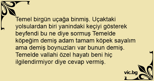 Temel birgün uçağa binmiş. Uçaktaki yolsulardan biri yanindaki keçiyi gösterek beyfendi bu ne diye sormuş Temelde köpeğim demiş adam tamam köpek sayalım ama demiş boynuzları var bunun demiş. Temelde vallahi özel hayatı beni hiç ilgilendirmiyor diye cevap vermiş.