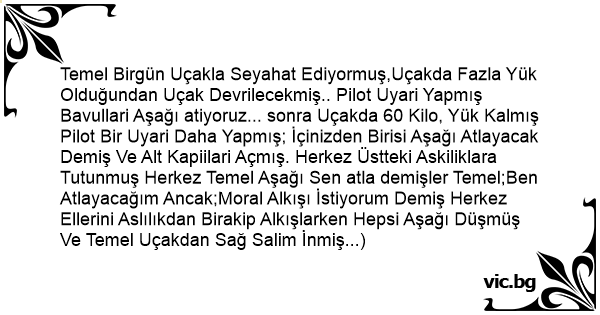 Temel Birgün Uçakla Seyahat Ediyormuş,Uçakda Fazla Yük Olduğundan Uçak Devrilecekmiş.. Pilot Uyari Yapmış Bavullari Aşağı atiyoruz... sonra Uçakda 60 Kilo, Yük Kalmış Pilot Bir Uyari Daha Yapmış; İçinizden Birisi Aşağı Atlayacak Demiş Ve Alt Kapiilari Açmış. Herkez Üstteki Askiliklara Tutunmuş Herkez Temel Aşağı Sen atla demişler Temel;Ben Atlayacağım Ancak;Moral Alkışı İstiyorum Demiş Herkez Ellerini Aslılıkdan Birakip Alkışlarken Hepsi Aşağı Düşmüş Ve Temel Uçakdan Sağ Salim İnmiş...)