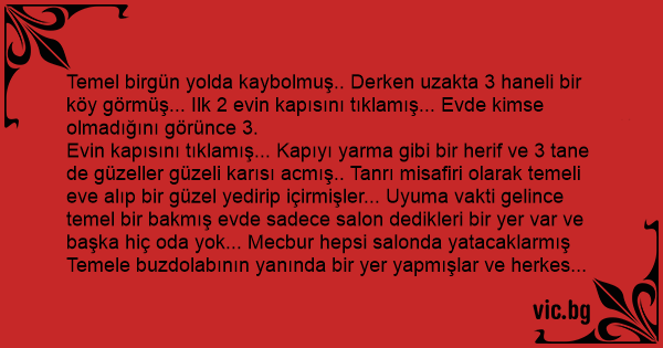 Evin kapısını tıklamış... Kapıyı yarma gibi bir herif ve 3 tane de güzeller güzeli karısı acmış.. Tanrı misafiri olarak temeli eve alıp bir güzel yedirip içirmişler... Uyuma vakti gelince temel bir bakmış evde sadece salon dedikleri bir yer var ve başka hiç oda yok... Mecbur hepsi salonda yatacaklarmış Temele buzdolabının yanında bir yer yapmışlar ve herkes yatmış... Adamın canı sекs istiyomuş... Ilk eşine "hadi soyun" demiş sessizce... Kadın da misafir var olmaz demiş... Adamda karısına "giт buzdolabının kapağını aç dolabın ışığıyla misafirin suratına bak eğer uyuyorsa gel yaparız" demiş... Kadın kocasının dediğini yapmış ve bakmışki temelin gözleri kapalı... Dönmüş ve kocasının koynuna girmiş... Adam tekrar azmış ve diğer karısına aynı şeyleri yapmasını söylemiş... Derken adam 3. karısını da boş geçmek istememiş ve onu da dolabın araya gönderip sonra bi güzel .. Kmiş... Sabah olunca kahvaltı sofrasında temele sormuş adam: