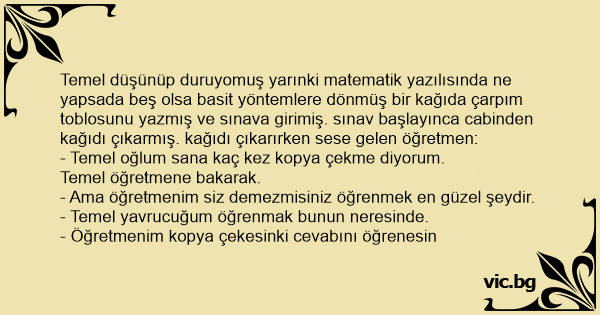 Temel düşünüp duruyomuş yarınki matematik yazılısında ne yapsada beş olsa basit yöntemlere dönmüş bir kağıda çarpım toblosunu yazmış ve sınava girimiş. sınav başlayınca cabinden kağıdı çıkarmış. kağıdı çıkarırken sese gelen öğretmen: