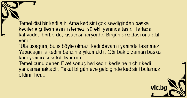 Temel bunu dener. Evet sonuç harikadir, kedisine hiçbir kedi yanasmamaktadir. Fakat birgün eve geldiginde kedisini bulamaz, çildirir, her tarafa bakar, kedisi ortada yoktur. Kosa kosa kahveye gider,: