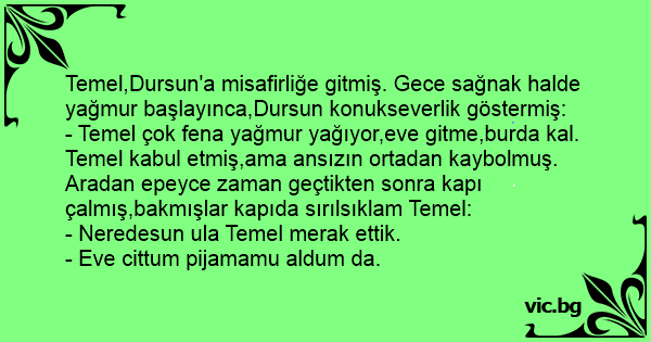 - Temel çok fena yağmur yağıyor,eve gitme,burda kal. Temel kabul etmiş,ama ansızın ortadan kaybolmuş. Aradan epeyce zaman geçtikten sonra kapı çalmış,bakmışlar kapıda sırılsıklam Temel: