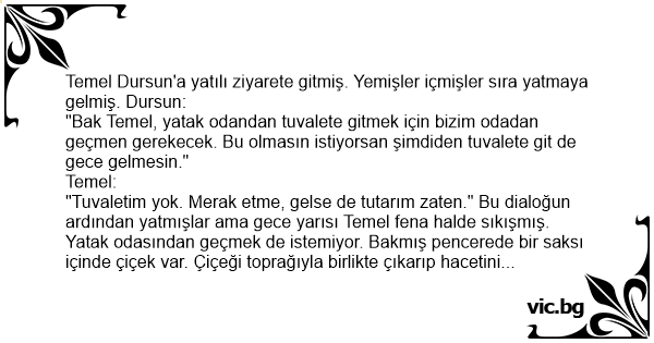 "Tuvaletim yok. Merak etme, gelse de tutarım zaten." Bu dialoğun ardından yatmışlar ama gece yarısı Temel fena halde sıkışmış. Yatak odasından geçmek de istemiyor. Bakmış pencerede bir saksı içinde çiçek var. Çiçeği toprağıyla birlikte çıkarıp hacetini gidermiş, toprağı tekrar yerine koyup uyumuş ve ertesi sabah da çekip gitmiş. Aradan birkaç ay geçtikten sonra Dursun Temel"
