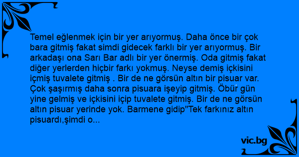 Temel eğlenmek için bir yer arıyormuş. Daha önce bir çok bara gitmiş fakat simdi gidecek farklı bir yer arıyormuş. Bir arkadaşı ona Sarı Bar adlı bir yer önermiş. Oda gitmiş fakat diğer yerlerden hiçbir farkı yokmuş. Neyse demiş içkisini içmiş tuvalete gitmiş . Bir de ne görsün altın bir pisuar var. Çok şaşırmış daha sonra pisuara işeyip gitmiş. Öbür gün yine gelmiş ve içkisini içip tuvalete gitmiş. Bir de ne görsün altın pisuar yerinde yok. Barmene gidip"Tek farkınız altın pisuardı,şimdi o da yok"demiş. Barmen barda oturan iri yarı adama dönüp "Necmi abii senin saksofona işeyen adam geldi" demiş.