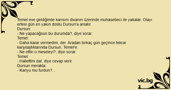 Temel eve geldiğinde karısını divanın üzerinde muhasebeci ile yakalar. Olayı ertesi gün en yakın dostu Dursun'a anlatır.