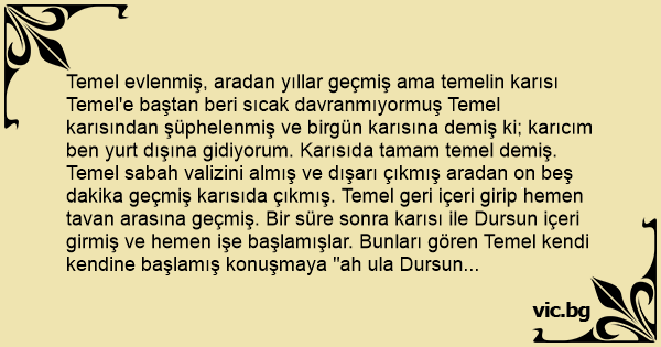 Temel evlenmiş, aradan yıllar geçmiş ama temelin karısı Temel'e baştan beri sıcak davranmıyormuş Temel karısından şüphelenmiş ve birgün karısına demiş ki; karıcım ben yurt dışına gidiyorum. Karısıda tamam temel demiş. Temel sabah valizini almış ve dışarı çıkmış aradan on beş dakika geçmiş karısıda çıkmış. Temel geri içeri girip hemen tavan arasına geçmiş. Bir süre sonra karısı ile Dursun içeri girmiş ve hemen işe başlamışlar. Bunları gören Temel kendi kendine başlamış konuşmaya "ah ula Dursun şimdi yurt dışında olmasaydım sana gösterirdim."