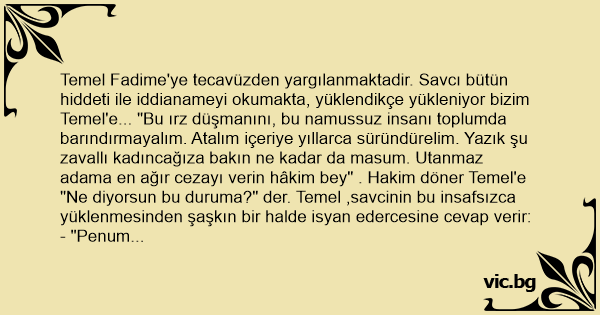 Temel Fadime'ye tecavüzden yargılanmaktadir. Savcı bütün hiddeti ile iddianameyi okumakta, yüklendikçe yükleniyor bizim Temel'e... "Bu ırz düşmanını, bu namussuz insanı toplumda barındırmayalım. Atalım içeriye yıllarca süründürelim. Yazık şu zavallı kadıncağıza bakın ne kadar da masum. Utanmaz adama en ağır cezayı verin hâkim bey" . Hakim döner Temel'e "Ne diyorsun bu duruma?" der. Temel ,savcinin bu insafsızca yüklenmesinden şaşkın bir halde isyan edercesine cevap verir: