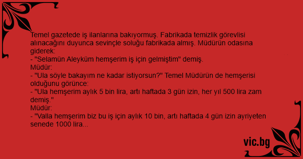 - "Valla hemşerim biz bu iş için aylık 10 bin, artı haftada 4 gün izin ayriyeten senede 1000 lira zam yaparuz." Temel sevinçten: