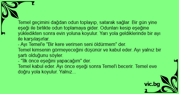 Temel geçimini dağdan odun toplayıp, satarak sağlar. Bir gün yine eşeği ile birlikte odun toplamaya gider. Odunları kesip eşeğine yükledikten sonra evin yoluna koyulur. Yarı yola geldiklerinde bir ayı ile karşılaşırlar.