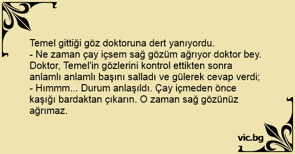 Temel bir gün hastaneye gider. Doktor: - Buyurun beyefendi, şikayetiniz nedir? Temel: - Doktor bey ben ne zaman çay içsem gözüm ağrıyor. Bunun üzerine doktor kısa bir muayenenin ardından Temel'e: -...
