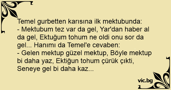 - Mektubum tez var da gel, Yar'dan haber al da gel, Ektuğum tohum ne oldi onu sor da gel... Hanımı da Temel'e cevaben: