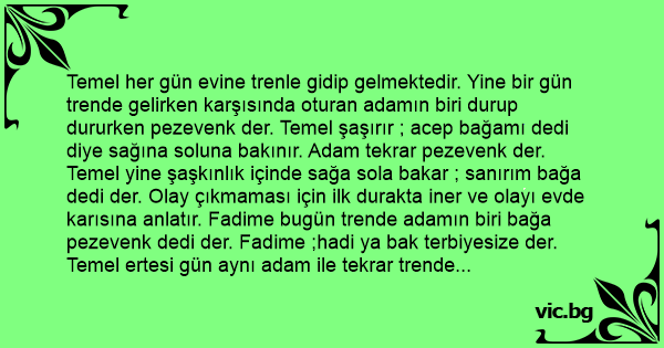 Temel her gün evine trenle gidip gelmektedir. Yine bir gün trende gelirken karşısında oturan adamın biri durup dururken pezevenk der. Temel şaşırır ; acep bağamı dedi diye sağına soluna bakınır. Adam tekrar pezevenk der. Temel yine şaşkınlık içinde sağa sola bakar ; sanırım bağa dedi der. Olay çıkmaması için ilk durakta iner ve olayı evde karısına anlatır. Fadime bugün trende adamın biri bağa pezevenk dedi der. Fadime ;hadi ya bak terbiyesize der. Temel ertesi gün aynı adam ile tekrar trende karşılaşır. Bu sefer adamın lafı çok ilginçtir. Temele bakar ve şöyle der:
