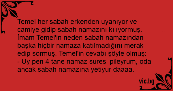 Temel her sabah erkenden uyanıyor ve camiye gidip sabah namazını kılıyormuş. İmam Temel'in neden sabah namazından başka hiçbir namaza katılmadığını merak edip sormuş. Temel'in cevabı şöyle olmuş: