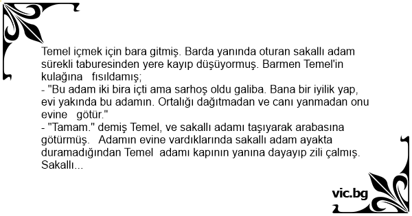 Sakallı adamın karısı kapıyı açmış. Temel - "Kocanızı eve getirdim. Ayakta durmakta zorluk çekiyor." demiş.