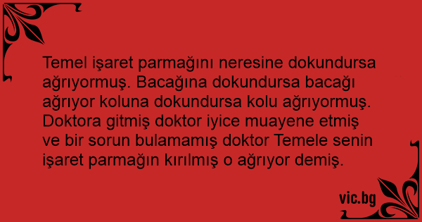 Temel işaret parmağını neresine dokundursa ağrıyormuş. Bacağına dokundursa bacağı ağrıyor koluna dokundursa kolu ağrıyormuş. Doktora gitmiş doktor iyice muayene etmiş ve bir sorun bulamamış doktor Temele senin işaret parmağın kırılmış o ağrıyor demiş.