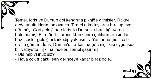 Temel, İdris ve Dursun göl kenarına pikniğe gitmişler. Rakıyı evde unuttuklarını anlayınca, Temel arkadaşlarını bırakıp eve dönmüş. Geri geldiğinde İdris ile Dursun'u bıraktığı yerde bulamamış. Bir müddet arandıktan sonra çalıların arasından bazı sesler geldiğini farkedip yaklaşmış. Yanlarına gidince bir de ne görsün: İdris, Dursun'un arkasına geçmiş, ikisi uygunsuz bir vaziyette ilişki halindeler. Temel şaşırmış: