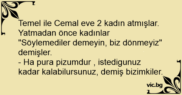 Temel ile Cemal eve 2 kadın atmışlar. Yatmadan önce kadınlar "Söylemediler demeyin, biz dönmeyiz" demişler.
