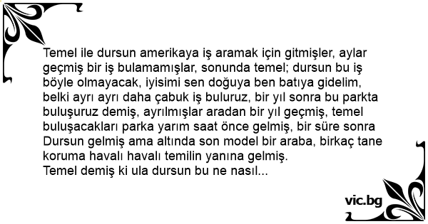 Temel ile dursun amerikaya iş aramak için gitmişler, aylar geçmiş bir iş bulamamışlar, sonunda temel; dursun bu iş böyle olmayacak, iyisimi sen doğuya ben batıya gidelim, belki ayrı ayrı daha çabuk iş buluruz, bir yıl sonra bu parkta buluşuruz demiş, ayrılmışlar aradan bir yıl geçmiş, temel buluşacakları parka yarım saat önce gelmiş, bir süre sonra Dursun gelmiş ama altında son model bir araba, birkaç tane koruma havalı havalı temilin yanına gelmiş.