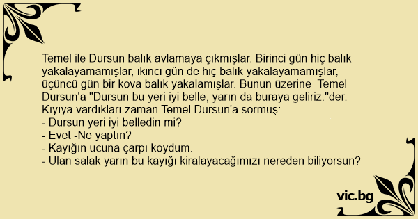 Temel ile Dursun balık avlamaya çıkmışlar. Birinci gün hiç balık yakalayamamışlar, ikinci gün de hiç balık yakalayamamışlar, üçüncü gün bir kova balık yakalamışlar. Bunun üzerine Temel Dursun'a "Dursun bu yeri iyi belle, yarın da buraya geliriz."der. Kıyıya vardıkları zaman Temel Dursun'a sormuş: