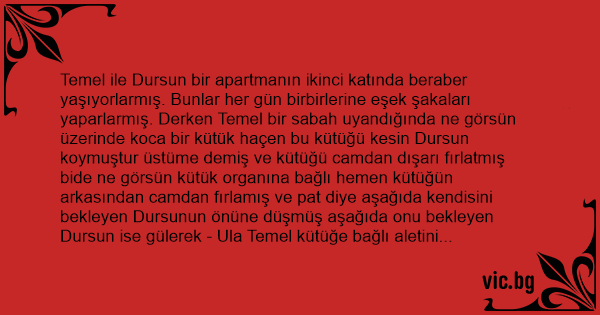 Temel ile Dursun bir apartmanın ikinci katında beraber yaşıyorlarmış. Bunlar her gün birbirlerine eşek şakaları yaparlarmış. Derken Temel bir sabah uyandığında ne görsün üzerinde koca bir kütük haçen bu kütüğü kesin Dursun koymuştur üstüme demiş ve kütüğü camdan dışarı fırlatmış bide ne görsün kütük organına bağlı hemen kütüğün arkasından camdan fırlamış ve pat diye aşağıda kendisini bekleyen Dursunun önüne düşmüş aşağıda onu bekleyen Dursun ise gülerek - Ula Temel kütüğe bağlı aletini farkettin ama yatağa bağlı topların ne olacak!