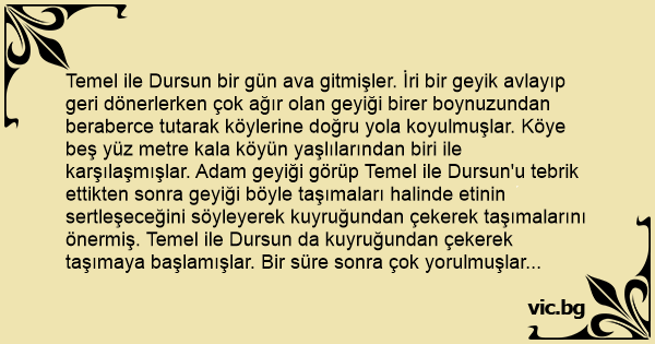 Temel ile Dursun bir gün ava gitmişler. İri bir geyik avlayıp geri dönerlerken çok ağır olan geyiği birer boynuzundan beraberce tutarak köylerine doğru yola koyulmuşlar. Köye beş yüz metre kala köyün yaşlılarından biri ile karşılaşmışlar. Adam geyiği görüp Temel ile Dursun'u tebrik ettikten sonra geyiği böyle taşımaları halinde etinin sertleşeceğini söyleyerek kuyruğundan çekerek taşımalarını önermiş. Temel ile Dursun da kuyruğundan çekerek taşımaya başlamışlar. Bir süre sonra çok yorulmuşlar ve Dursun Temel'e dönüp: