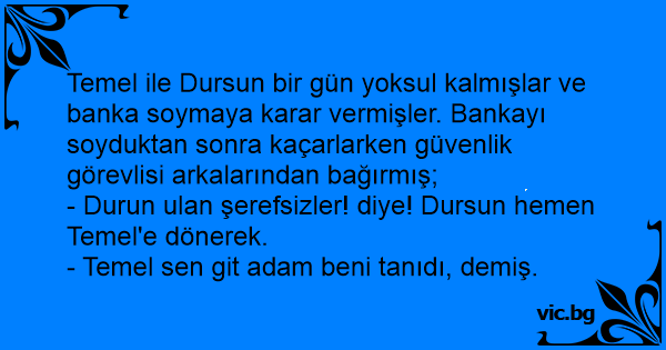 Temel ile Dursun bir gün yoksul kalmışlar ve banka soymaya karar vermişler. Bankayı soyduktan sonra kaçarlarken güvenlik görevlisi arkalarından bağırmış;