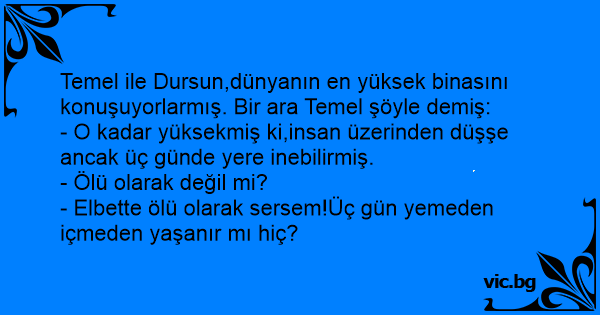 Temel ile Dursun,dünyanın en yüksek binasını konuşuyorlarmış. Bir ara Temel şöyle demiş: