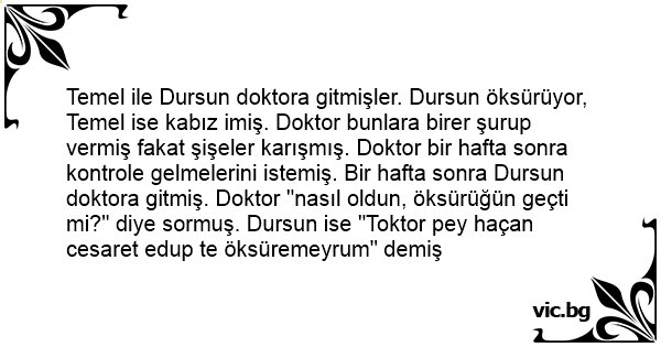 Temel ile Dursun doktora gitmişler. Dursun öksürüyor, Temel ise kabız imiş. Doktor bunlara birer şurup vermiş fakat şişeler karışmış. Doktor bir hafta sonra kontrole gelmelerini istemiş. Bir hafta sonra Dursun doktora gitmiş. Doktor "nasıl oldun, öksürüğün geçti mi?" diye sormuş. Dursun ise "Toktor pey haçan cesaret edup te öksüremeyrum" demiş