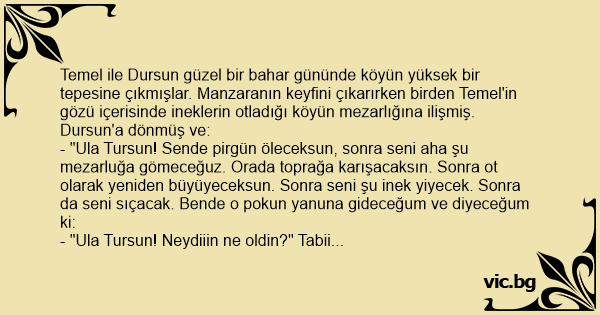 - "Ula Tursun! Sende pirgün öleceksun, sonra seni aha şu mezarluğa gömeceğuz. Orada toprağa karışacaksın. Sonra ot olarak yeniden büyüyeceksun. Sonra seni şu inek yiyecek. Sonra da seni sıçacak. Bende o pokun yanuna gideceğum ve diyeceğum ki: