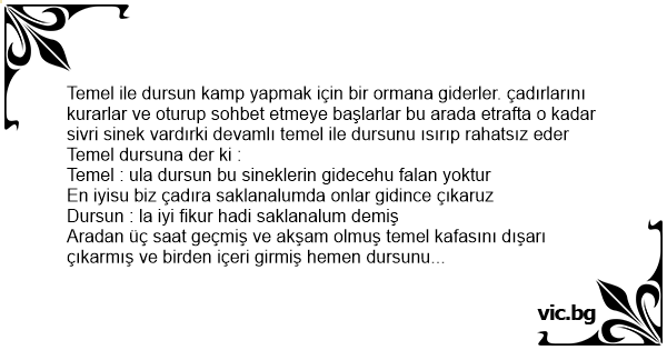 Temel ile dursun kamp yapmak için bir ormana giderler. çadırlarını kurarlar ve oturup sohbet etmeye başlarlar bu arada etrafta o kadar sivri sinek vardırki devamlı temel ile dursunu ısırıp rahatsız eder