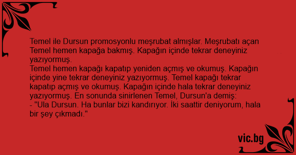 Temel ile Dursun promosyonlu meşrubat almışlar. Meşrubatı açan Temel hemen kapağa bakmış. Kapağın içinde tekrar deneyiniz yazıyormuş.