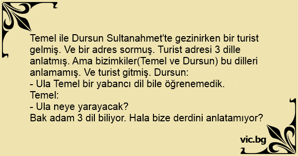 Temel ile Dursun Sultanahmet'te gezinirken bir turist gelmiş. Ve bir adres sormuş. Turist adresi 3 dille anlatmış. Ama bizimkiler(Temel ve Dursun) bu dilleri anlamamış. Ve turist gitmiş. Dursun: