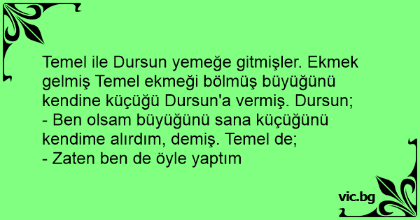 Temel ile Dursun yemeğe gitmişler. Ekmek gelmiş Temel ekmeği bölmüş büyüğünü kendine küçüğü Dursun'a vermiş. Dursun;