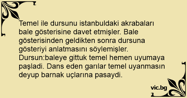 Dursun:baleye gittuk temel hemen uyumaya paşladi. Dans eden garılar temel uyanmasın deyup barnak uçlarına pasaydi.