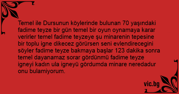 Temel ile Dursunun köylerinde bulunan 70 yaşındaki fadime teyze bir gün temel bir oyun oynamaya karar verirler temel fadime teyzeye şu minarenin tepesine bir toplu igne dikecez görürsen seni evlendirecegini söyler fadime teyze bakmaya başlar 123 dakika sonra temel dayanamaz sorar gördünmü fadime teyze igneyi kadın ula igneyü gördumda minare neredadur onu bulamiyorum.