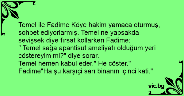 Temel ile Fadime Köye hakim yamaca oturmuş, sohbet ediyorlarmış. Temel ne yapsakda sevişsek diye fırsat kollarken Fadime: