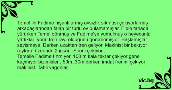 Temel ile Fadime nişanlılarmış evsizlik sıkıntısı çekiyorlarmış arkadaşlarından falan bir türlü ev bulamamışlar. Elele tarlada yürürken Temel dönmüş ve Fadime'ye yumulmuş o heyecanla yattıkları yerin tren rayı olduğunu görememişler. Başlamışlar sevismeye. Derken uzaktan tren geliyor. Makinist bir bakıyor rayların üzerinde 2 insan. Sireni çekiyor..