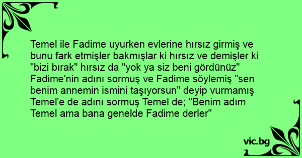 Temel ile Fadime uyurken evlerine hırsız girmiş ve bunu fark etmişler bakmışlar ki hırsız ve demişler ki "bizi bırak" hırsız da "yok ya siz beni gördünüz" Fadime'nin adını sormuş ve Fadime söylemiş "sen benim annemin ismini taşıyorsun" deyip vurmamış Temel'e de adını sormuş Temel de; "Benim adım Temel ama bana genelde Fadime derler"