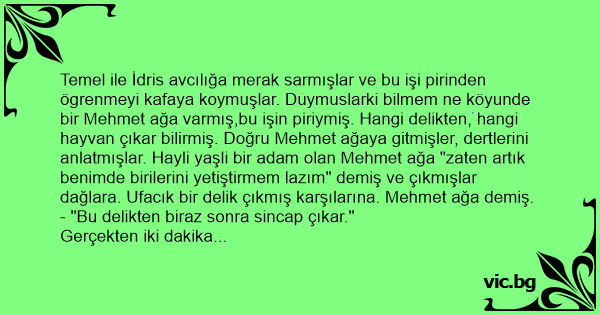 Temel ile İdris avcılığa merak sarmışlar ve bu işi pirinden ögrenmeyi kafaya koymuşlar. Duymuslarki bilmem ne köyunde bir Mehmet ağa varmış,bu işin piriymiş. Hangi delikten, hangi hayvan çıkar bilirmiş. Doğru Mehmet ağaya gitmişler, dertlerini anlatmışlar. Hayli yaşli bir adam olan Mehmet ağa "zaten artık benimde birilerini yetiştirmem lazım" demiş ve çıkmışlar dağlara. Ufacık bir delik çıkmış karşılarına. Mehmet ağa demiş.