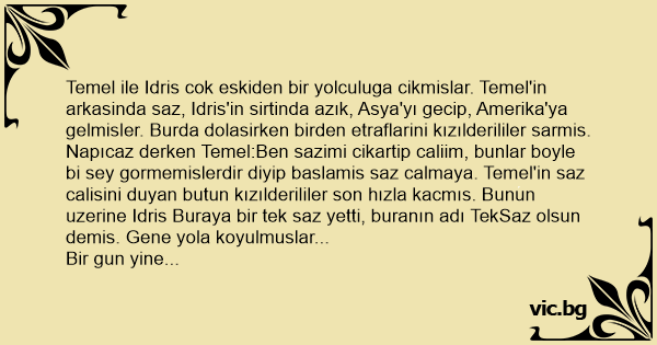 Temel ile Idris сок eskiden bir yolculuga cikmislar. Temel'in arkasinda saz, Idris'in sirtinda azık, Asya'yı gecip, Amerika'ya gelmisler. Burda dolasirken birden etraflarini kızılderililer sarmis. Napıcaz derken Temel:Ben sazimi cikartip caliim, bunlar boyle bi sey gormemislerdir diyip baslamis saz calmaya. Temel'in saz calisini duyan butun kızılderililer son hızla kacmıs. Bunun uzerine Idris Buraya bir tek saz yetti, buranın adı TekSaz olsun demis. Gene yola koyulmuslar...