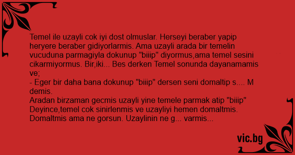 Temel ile uzayli сок iyi dost olmuslar. Herseyi beraber yapip heryere beraber gidiyorlarmis. Ama uzayli arada bir temelin vucuduna parmagiyla dokunup "biiip" diyormus,ama temel sesini cikarmiyormus. Bir,iki... Bes derken Temel sonunda dayanamamis ve;