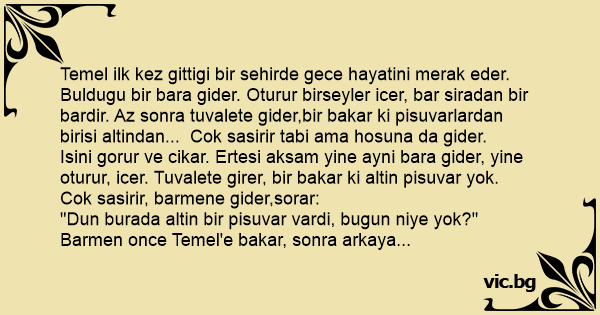 Isini gorur ve cikar. Ertesi aksam yine ayni bara gider, yine oturur, icer. Tuvalete girer, bir bakar ki altin pisuvar yok.