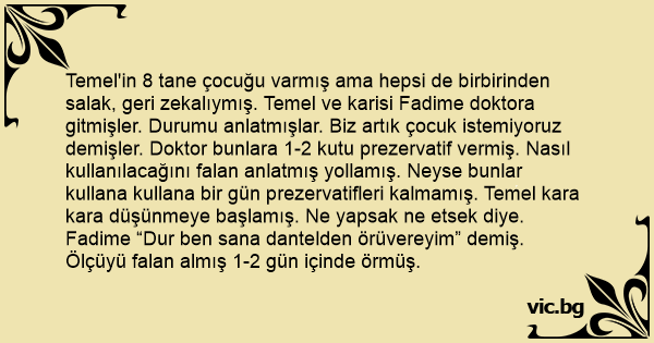 Temel'in 8 tane çocuğu varmış ama hepsi de birbirinden salak, geri zekalıymış. Temel ve karisi Fadime doktora gitmişler. Durumu anlatmışlar. Biz artık çocuk istemiyoruz demişler. Doktor bunlara 1-2 kutu prezervatif vermiş. Nasıl kullanılacağını falan anlatmış yollamış. Neyse bunlar kullana kullana bir gün prezervatifleri kalmamış. Temel kara kara düşünmeye başlamış. Ne yapsak ne etsek diye. Fadime “Dur ben sana dantelden örüvereyim” demiş. Ölçüyü falan almış 1-2 gün içinde örmüş.
