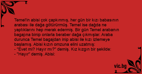 Temel'in abisi çok çapkınmış, her gün bir kızı babasının arabası ile dağa götürürmüş. Temel ise dağda ne yaptıklarını hep merak edermiş. Bir gün Temel arabanın bagajına binip onlarla beraber dağa çıkmışlar. Araba durunca Temel bagajdan inip abisi ile kızı izlemeye başlamış. Abisi kızın omzuna elini uzatmış: