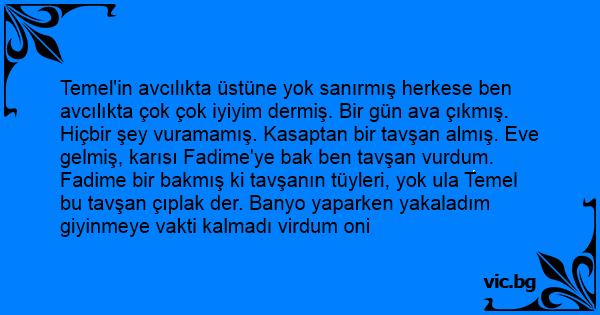 Temel'in avcılıkta üstüne yok sanırmış herkese ben avcılıkta çok çok iyiyim dermiş. Bir gün ava çıkmış. Hiçbir şey vuramamış. Kasaptan bir tavşan almış. Eve gelmiş, karısı Fadime'ye bak ben tavşan vurdum. Fadime bir bakmış ki tavşanın tüyleri, yok ula Temel bu tavşan çıplak der. Banyo yaparken yakaladım giyinmeye vakti kalmadı virdum oni