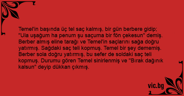 Berber almış eline tarağı ve Temel'in saçlarını sağa doğru yatırmış. Sağdaki saç teli kopmuş. Temel bir şey dememiş. Berber sola doğru yatırmış, bu sefer de soldaki saç teli kopmuş. Durumu gören Temel sinirlenmiş ve "Bırak dağınık kalsun" deyip dükkan çıkmış.