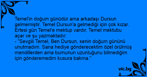 - "Sevgili Temel, Ben Dursun, senin doğum gününü unutmadım. Sana hediye gönderecektim özel örülmüş mendillerden ama burnunun uzunluğunu bilmediğim için gönderemedim kusura bakma."