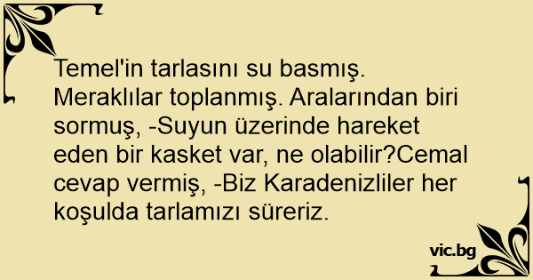 Temel'in tarlasını su basmış. Meraklılar toplanmış. Aralarından biri sormuş, -Suyun üzerinde hareket eden bir kasket var, ne olabilir?Cemal cevap vermiş, -Biz Karadenizliler her koşulda tarlamızı süreriz.