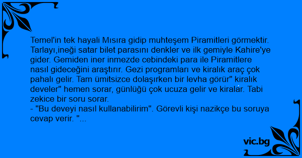 Temel'in tek hayali Mısıra gidip muhteşem Piramitleri görmektir. Tarlayı,ineği satar bilet parasını denkler ve ilk gemiyle Kahire'ye gider. Gemiden iner inmezde cebindeki para ile Piramitlere nasıl gideceğini araştırır. Gezi programları ve kiralık araç çok pahalı gelir. Tam ümitsizce dolaşırken bir levha görür" kiralık develer" hemen sorar, günlüğü çok ucuza gelir ve kiralar. Tabi zekice bir soru sorar.